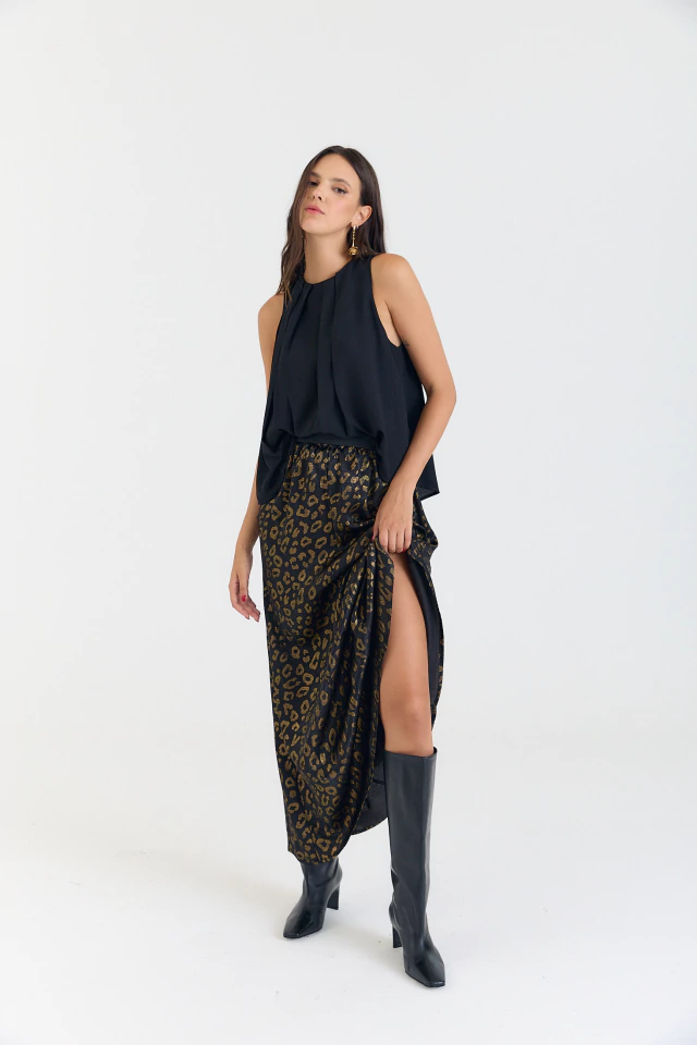 Falda de seda satin foil print dorado. Cintura elastica