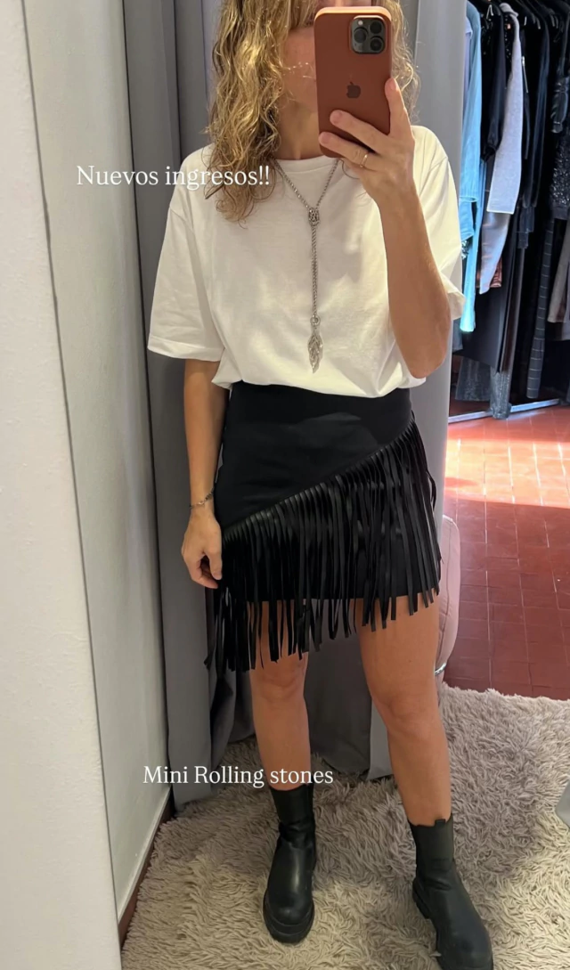 Mini de bengalina con detalles de flecos en cuero vegano.