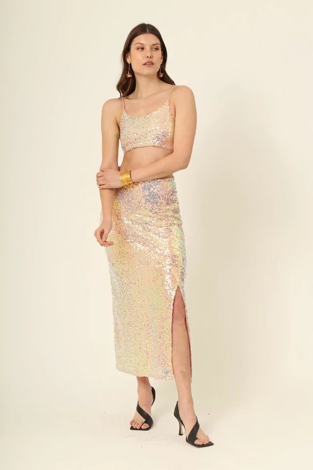 Set de top y falda midi al cuerpo en lentejuelas tornasoladas. Forrado en primera piel. Top con detalle de hebillas en espalda.
